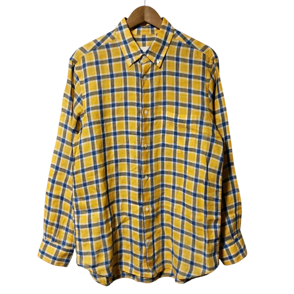 - Papas パパス リネンシャツ チェック 長袖 L イエロー ブルー CANCLINI 麻100% メンズ A29