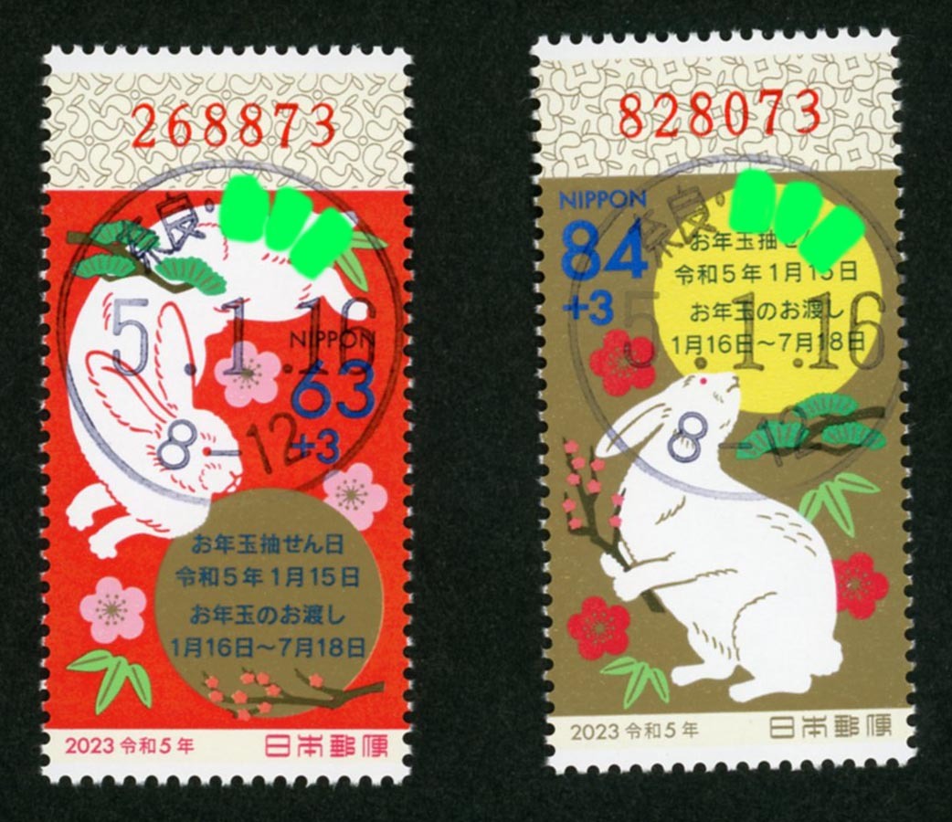 24313◆2023年用 年賀切手2種 お年玉交換初日の消印★令和5年用 使用済 ウサギ 66円 87円 63円 84円