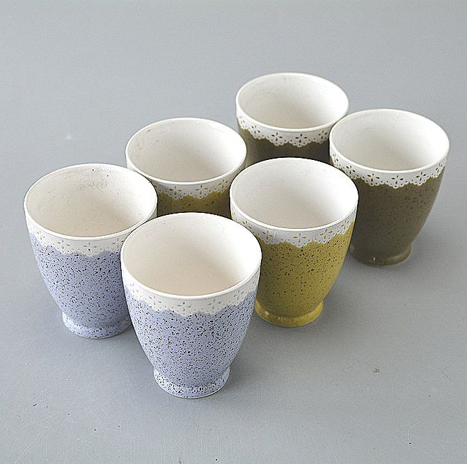 - フリーカップ 6個セット 湯飲み かわいいレース模様 パープル イエロー グリーン