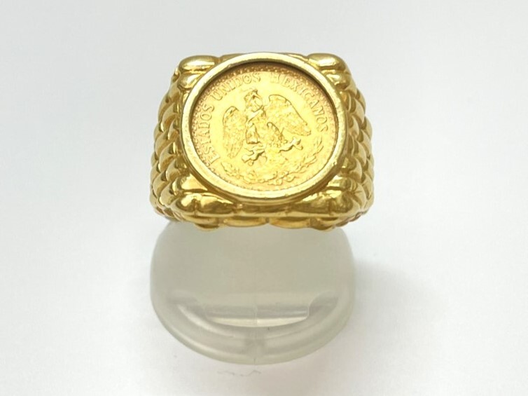 - 【送料無料】K21.6 21.6金 コイン メキシコ 2ペソ 1.6g K18 18金 イエロー ゴールド 7.3g 総計8.9g 印台風 リング 指輪 13号 店舗受取り可