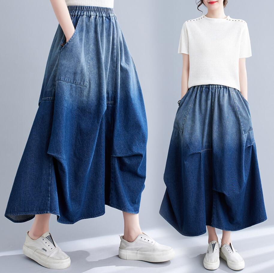- 人気推薦/レディース デニムスカート ウエストゴム ポケット デニムロングスカート 体型カバー ヴィンテージ加工 着痩せ ロングスカート