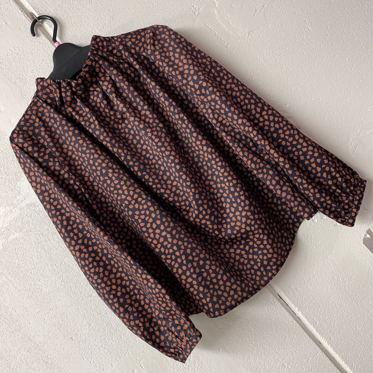 - Mサイズ首元ゴム使いシャーリングサテン生地アニマル柄プルオーバー