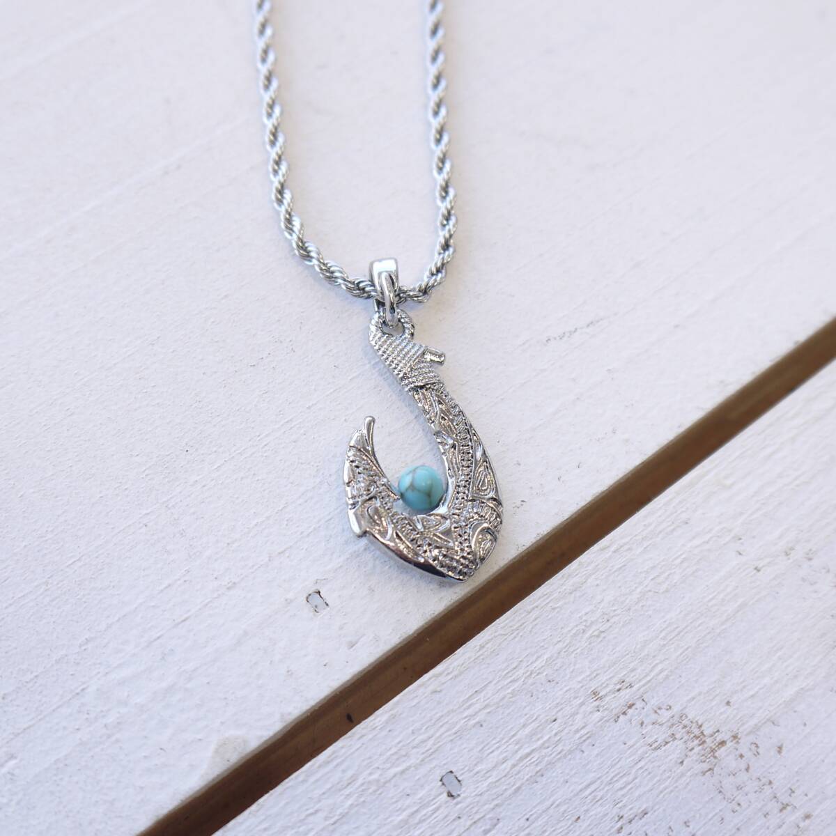 - ★ハワイアン雑貨★フィッシュフックストーン ネックレス/ユニセックス/ペンダント/サーファー/ハワイアンジュエリー 風<ターコイズ>