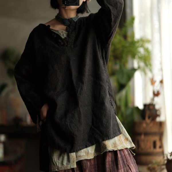 - lgn 2096 チュニック トップス アンティーク風 ロマンファッション 麻100%リネン ゆったりブラック