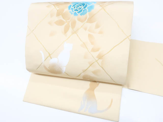 > 《京都一輝堂》【着物】九寸名古屋帯 オリジナル 金彩 太鼓柄 ぼかし 薔薇に猫文 r7b03-53