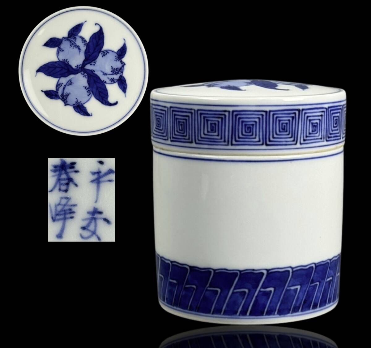 > 【偲】平安春峰 京焼 茶入れ 茶筒 染付 桃の絵柄 在銘 白磁 高さ約8.5㌢ 口直径約5.6㌢ e-18