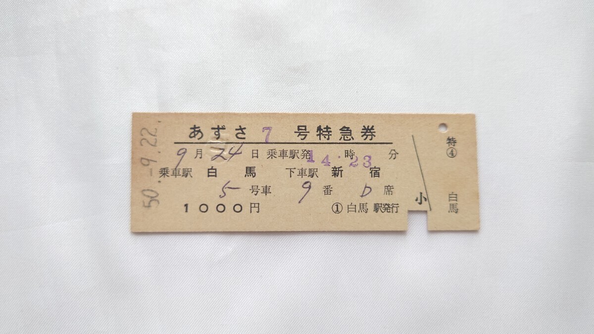 - ▼国鉄▼白馬→新宿 あずさ7号特急券▼D型硬券昭和50年