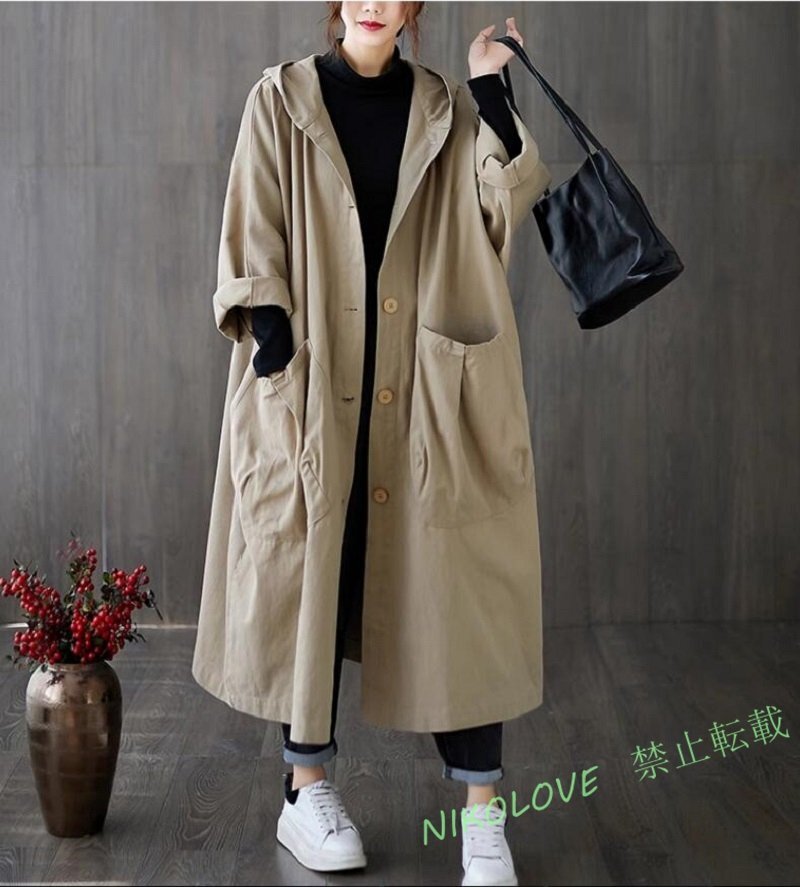 > ☆新品 スプリングコートカジュアルゆったり大きいサイズ体型カバーフード付きロングトレンチコートスプリングコートカーキ MK506