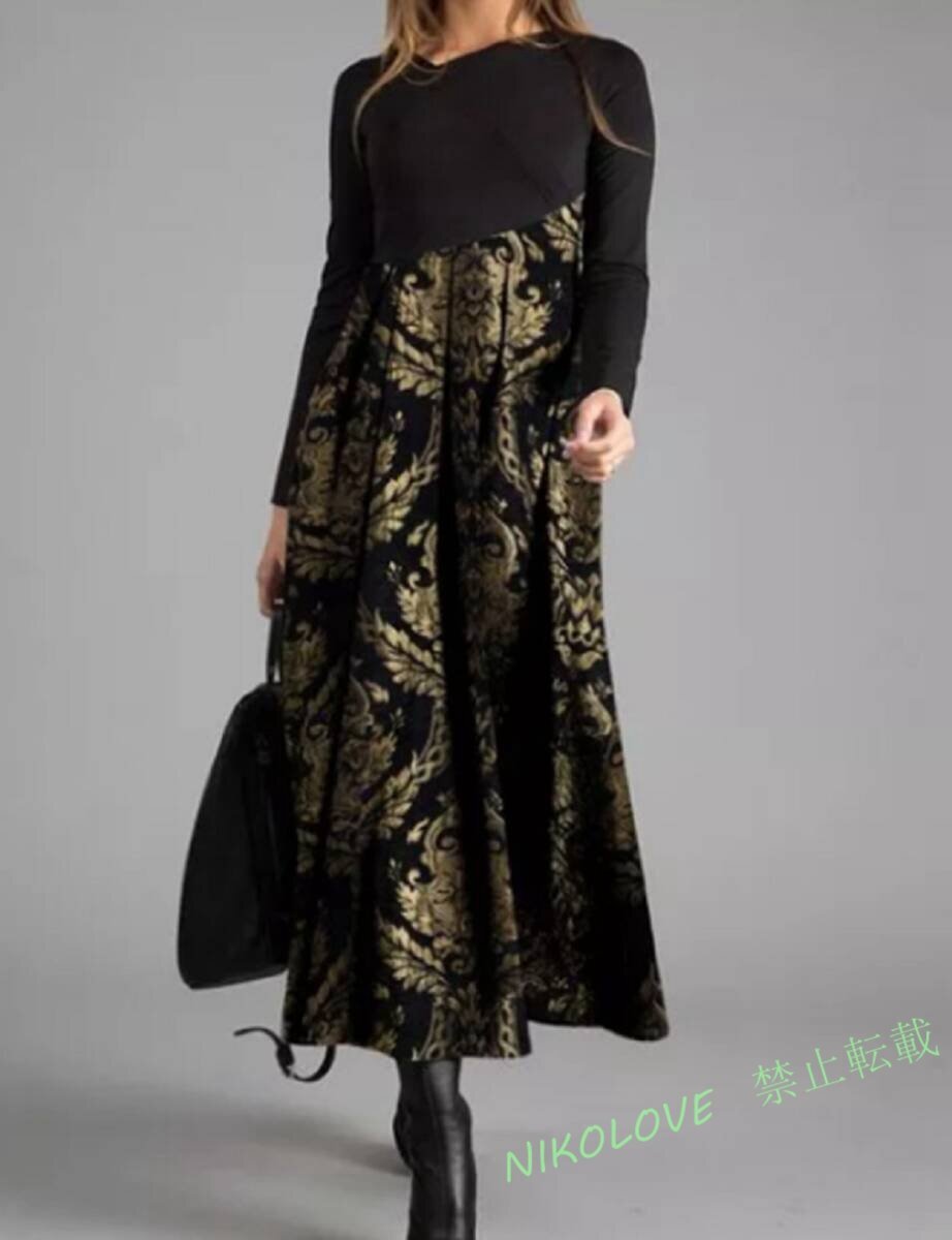 > ☆新品 ジャージーニット素材の切り替え長袖ワンピ★ ★大きいサイズ★黒&お花柄が おしゃれなハイウエストワンピ MK518