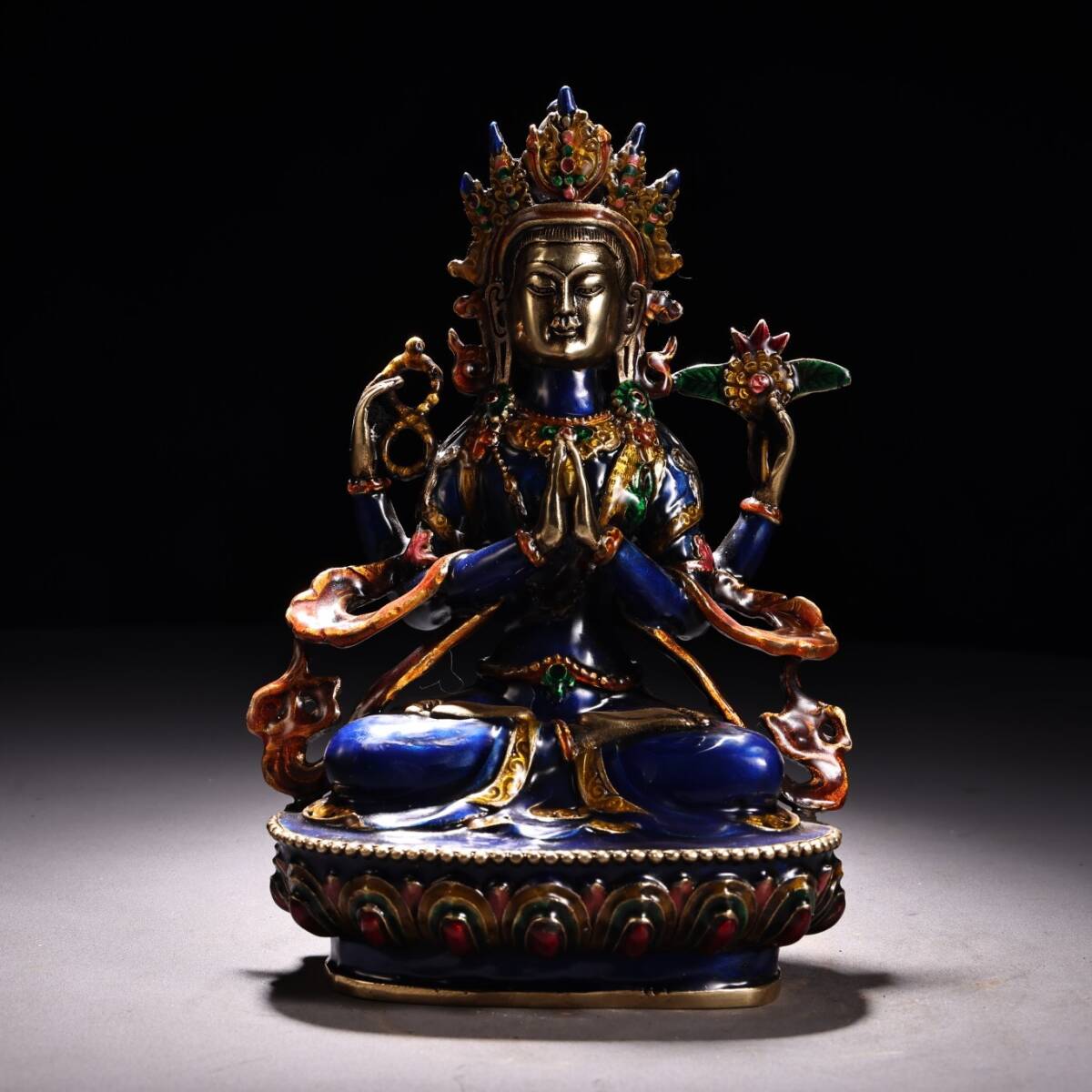 - 【超珍館蔵】銅製 景泰藍 琺瑯彩 四臂觀音像 置物 古賞物 古美術品 稀少珍蔵品