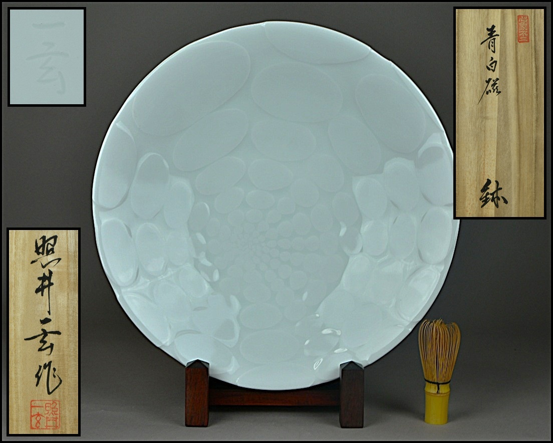 > 有田焼 岳窯【照井一玄】青白磁 水泡文 鉢 飾皿 共箱 美術品 直径39cm D253-11