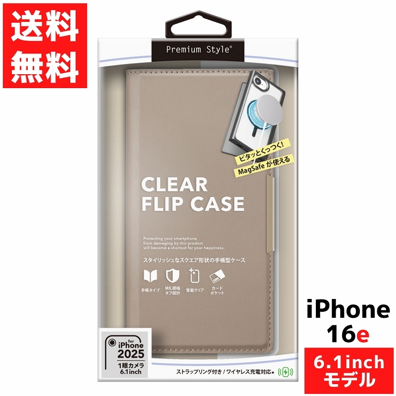 - iPhone 16e用 MagSafe 対応 クリアフリップケース ベージュ マグセーフ アイフォン マグネットロック ストラップホール ワイヤレス