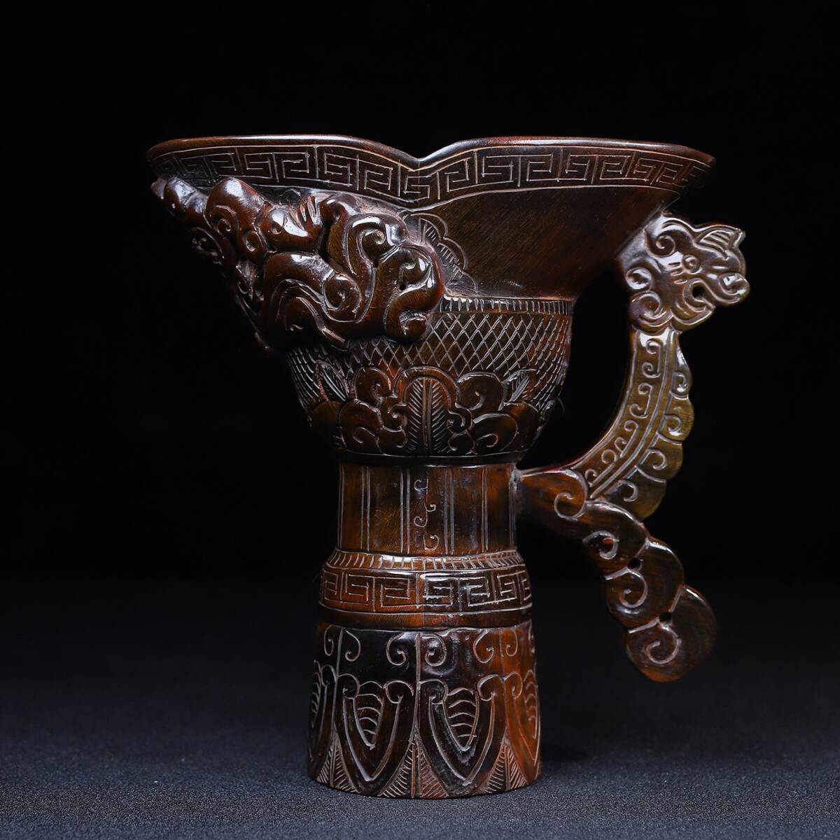 - ▽鴻▽ 角材細密彫 龍酒杯 置物 古賞物 中国古玩 中国古美術