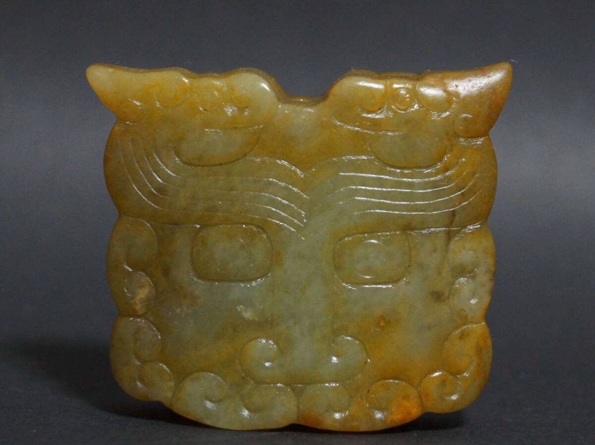 - 【閑】古代 和田玉(ホータン)細工彫り『玉獣面』珮 根付 帯飾り 提げ物 装飾品☆戦漢彫☆時代物☆7D0318