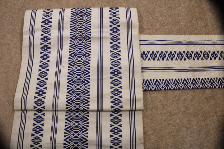 > きもの今昔8334 本場筑前博多織 白地に紺色三献上 名古屋帯(太鼓側115cm折返り) 全体長さ350cm