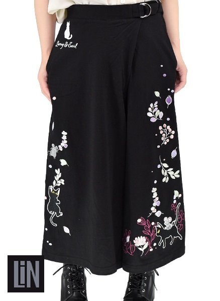 > ラミ&アール「leaves dancing in the wind総刺繍カフェパンツ」◆LIN ブラックMサイズ レディース AL-75774 黒猫 ネコ ネズミ
