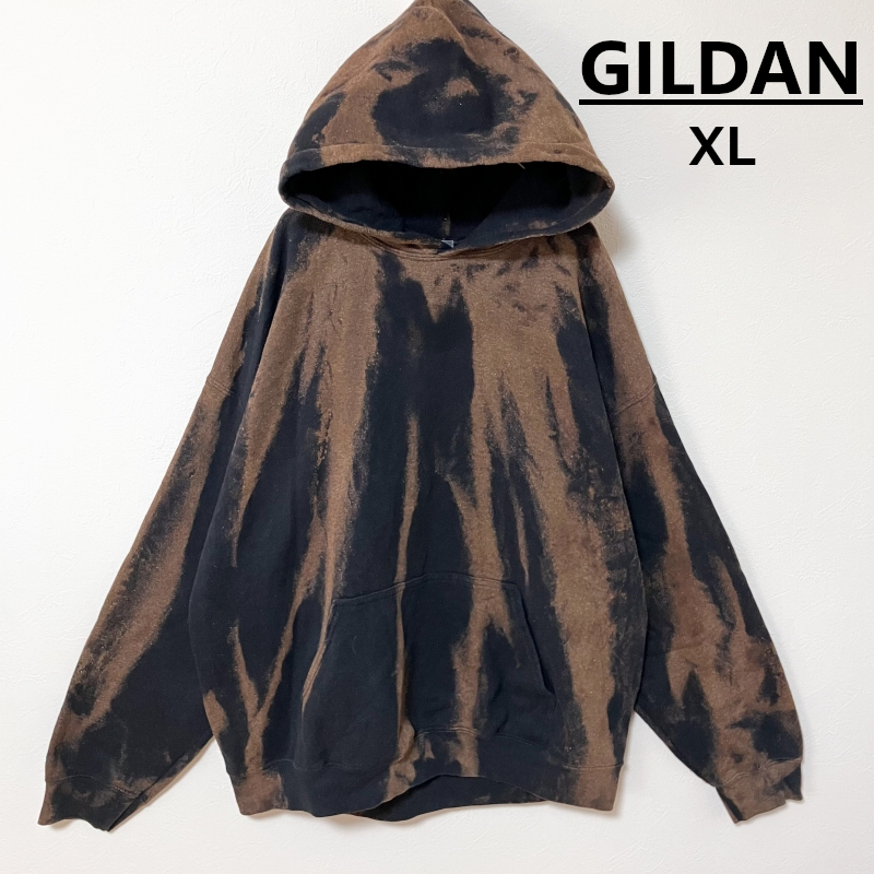 - GILDAN タイダイ柄ブリーチプルオーバーパーカーXL 黒 ブラウン ブランド