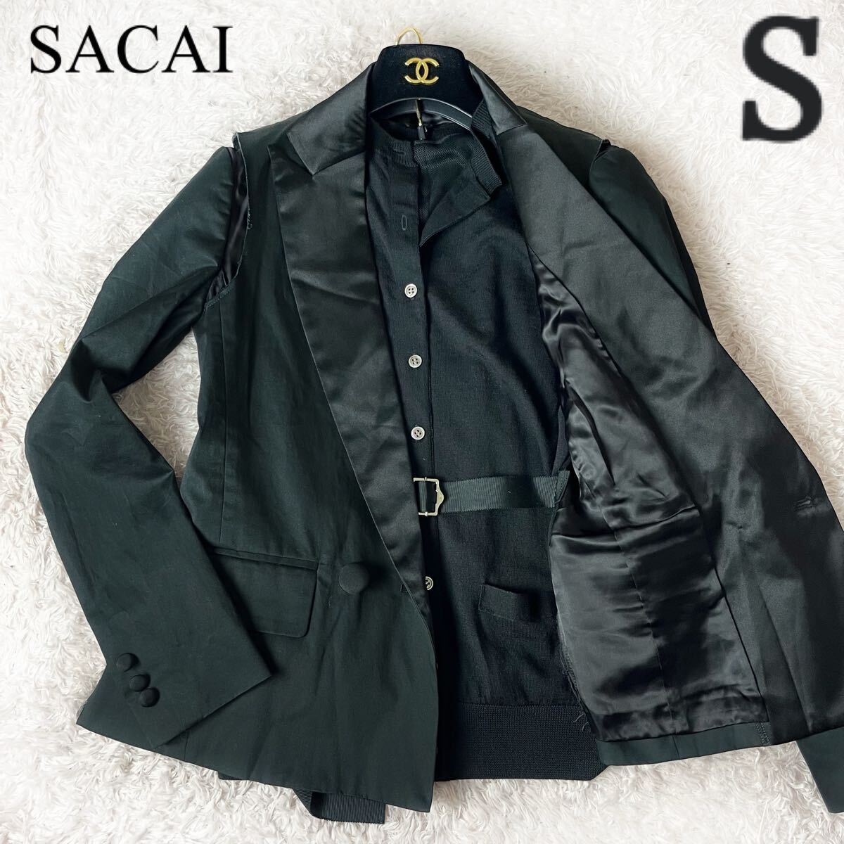 > SACAI サカイ テーラードジャケット タキシード ベスト ベルト 異素材ミックス レイヤード シルク カシミヤ カシミア 黒 ブラック S 1