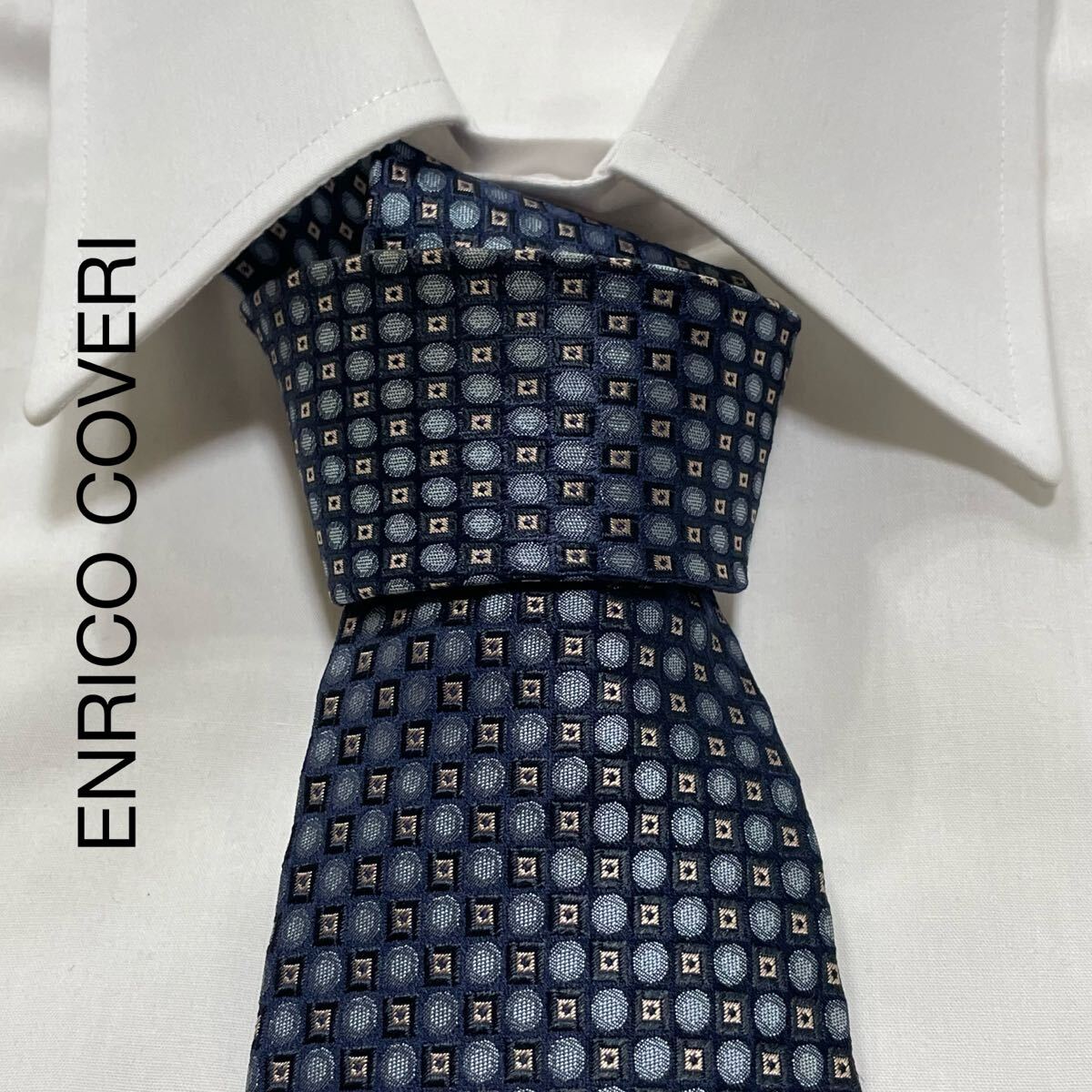- ENRICO COVERI エンリココベリ 総柄 ジャガード シルク ネクタイ イタリア製 ネイビー ブルー ベージュ TG1226