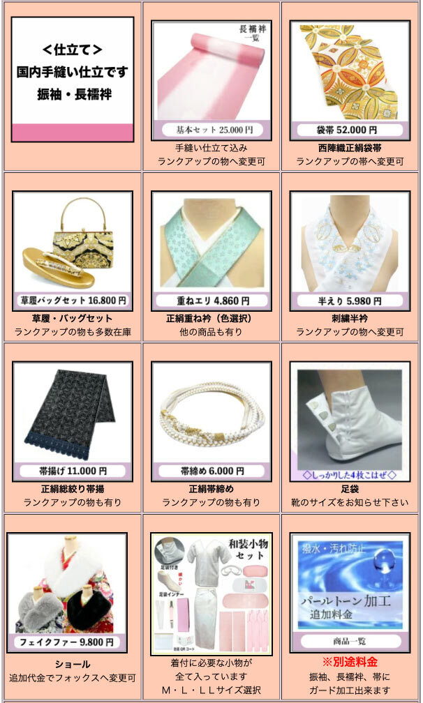 - 振袖フルセット 国内手縫い仕立て 振袖ご購入の方限定 si-003 着付け小物 草履バッグ ショール 和装小物がすべて揃います