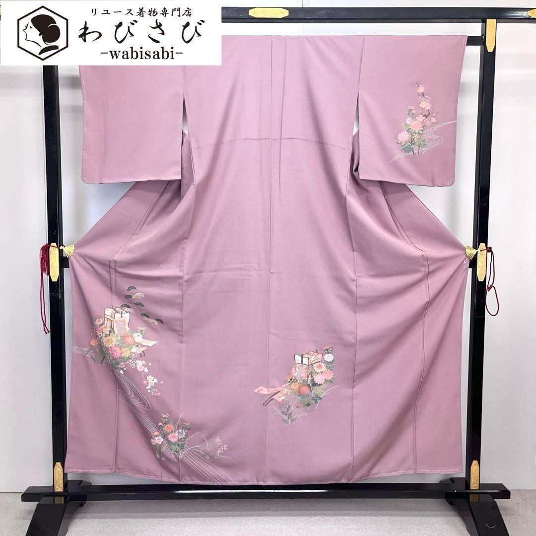 積紅色の縮緬に総相良刺繍でデザインされた御所車に花模様、松の柄裄の素敵なお品でございます。