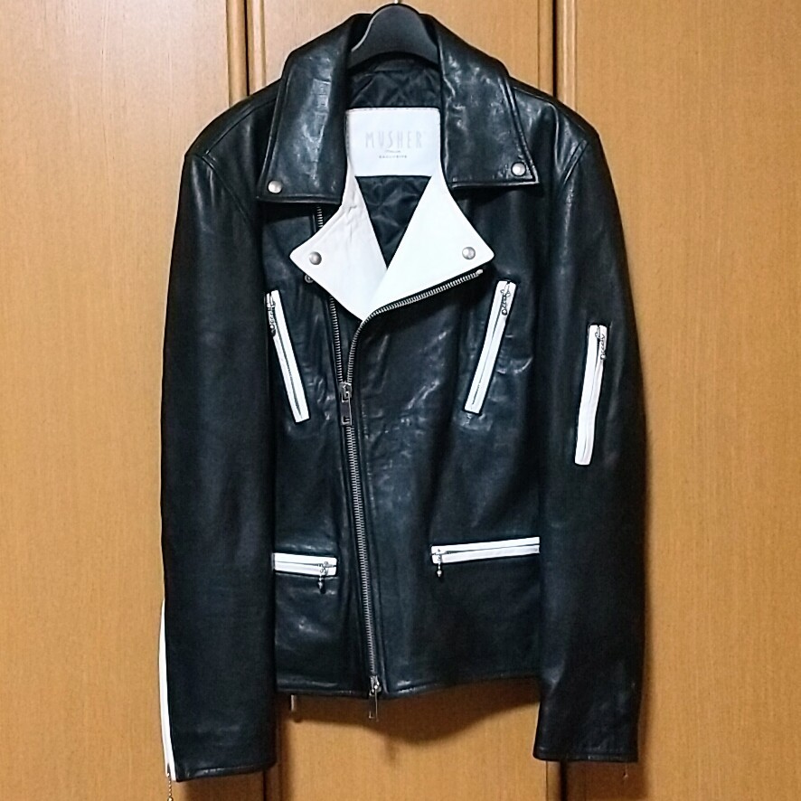 > MUSHER マーシャー ダブルライダースジャケット L 38 40 バイカラー ブラック 白 黒 羊革 lewis leathers 666 ライトニング イタリア製