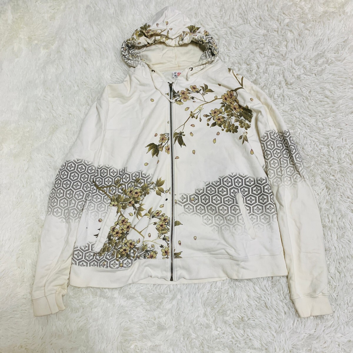 - 華鳥風月 カチョウフウゲツ パーカー 総柄 刺繍 スウェット ホワイト サイズXXL ジップアップ