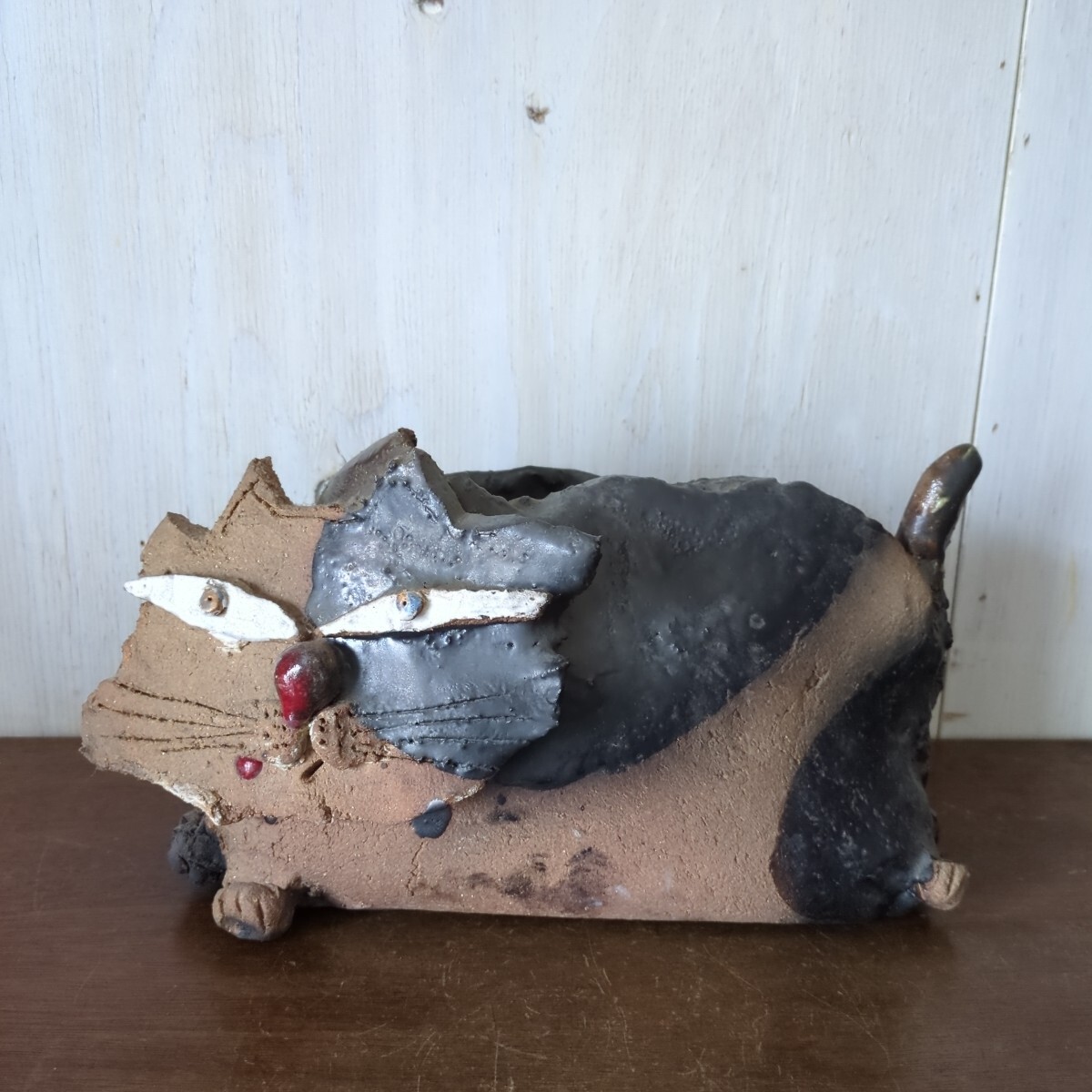 - 馬酔木窯 あびし 陶芸家 森正 猫 置物 オブジェ レターボックス 箱無し 陶器 アート ネコ ねこ 万古焼 萬古焼