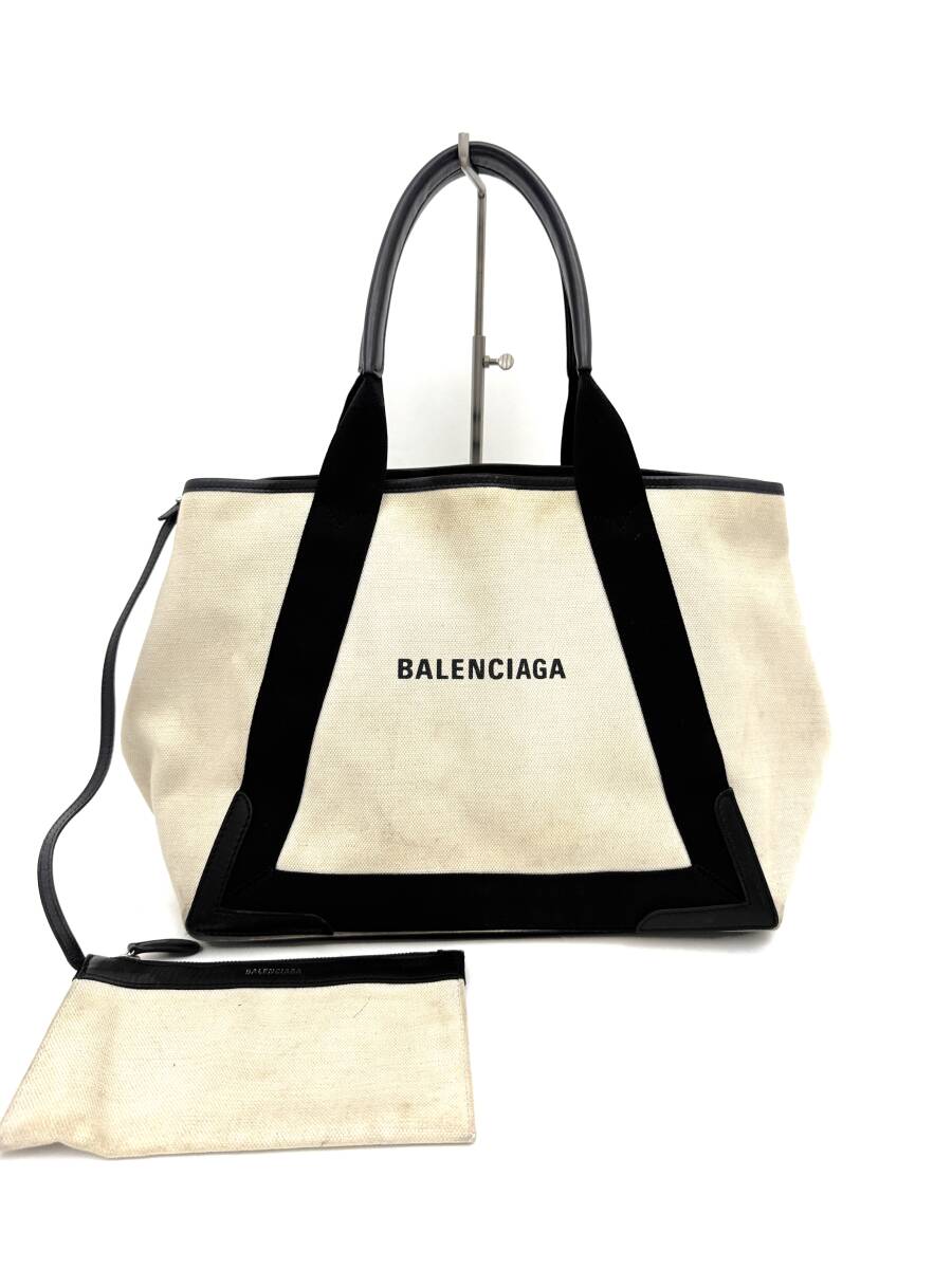 - 7D0607【本物保証】バレンシアガ 581292 ネイビーカバス M トート バッグ ポーチ ブラック アイボリー キャンバス レザー ロゴ BALENCIAGA