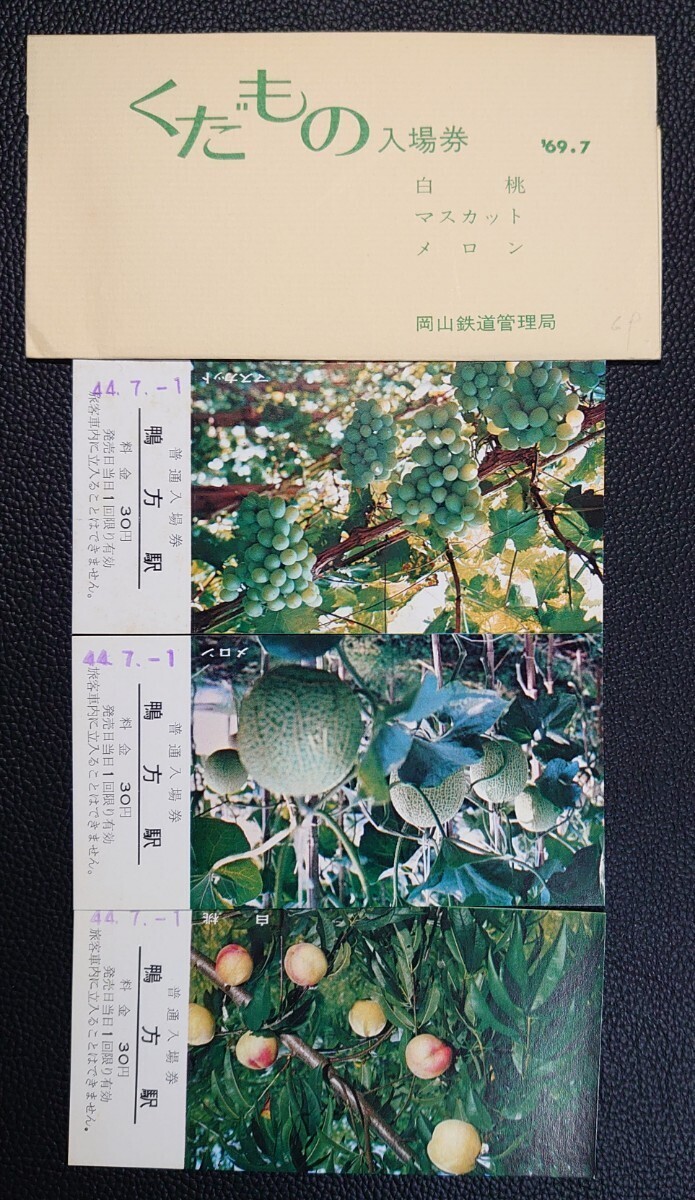 - 【記念切符】’69.7 くだもの入場券 岡山鉄道管理局/白桃 マスカット メロン/44.7.-1 鴨方駅