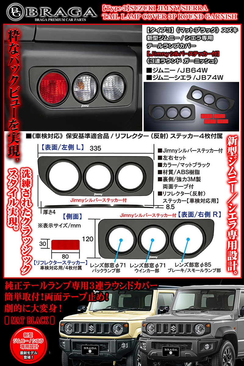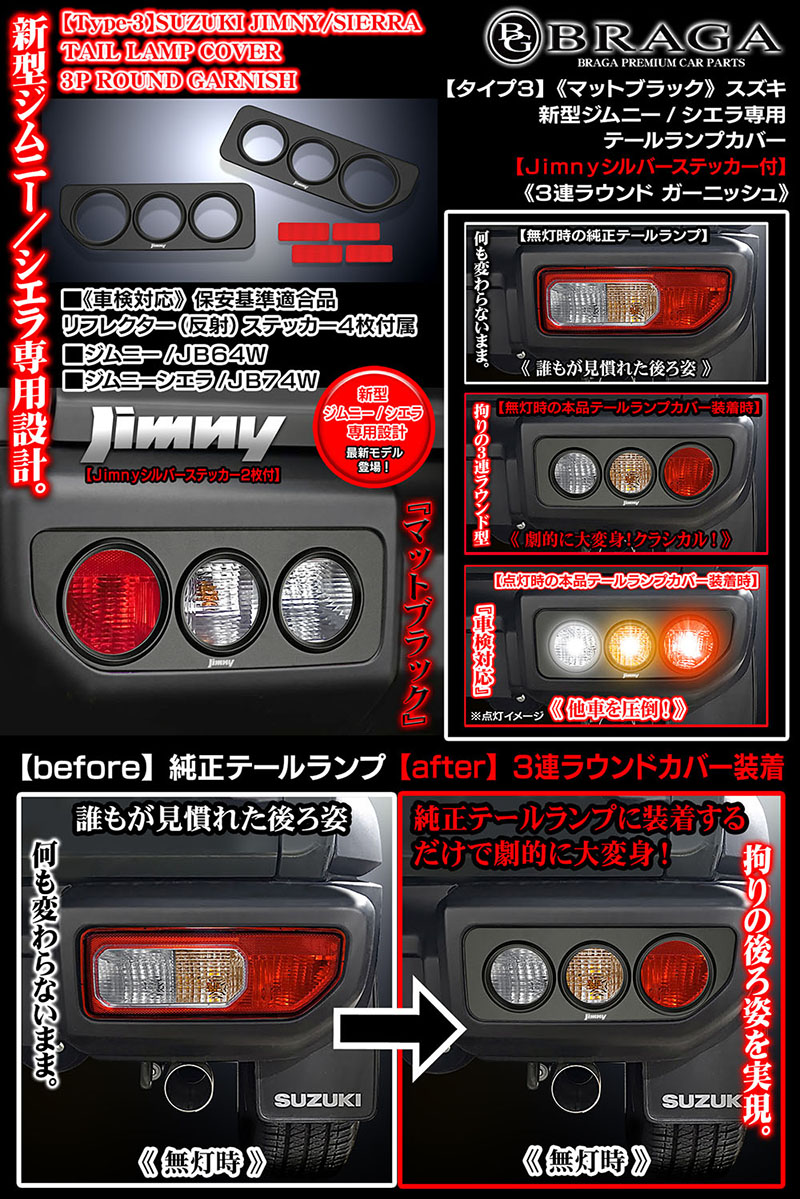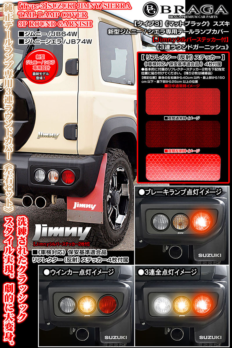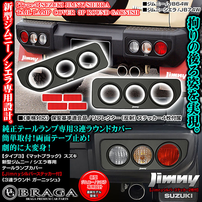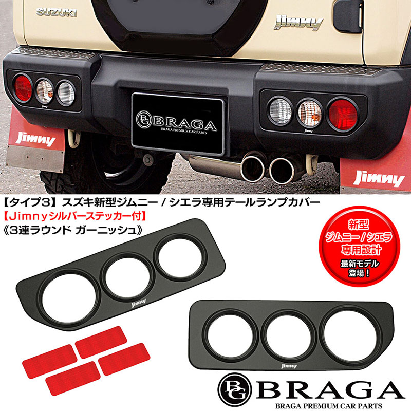 > 【タイプ3】Jimnyロゴ付/スズキ JB64/74 ジムニー シエラ/テールランプ カバー/3連丸型ラウンド ガーニッシュ/艶消し黒/車検対応/ブラガ