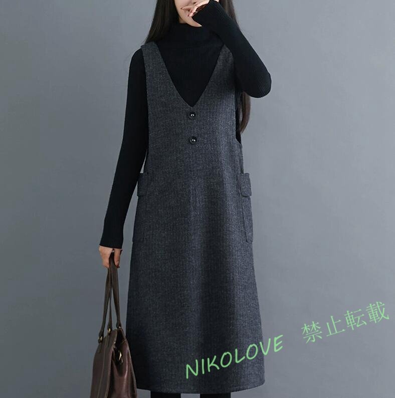 - 新品 ジャンパースカート きれいめ ノースリーブワンピース 暖かい 裏起毛 大人 ゆったり 通勤 オフィス vネック ラシャ ワンピース