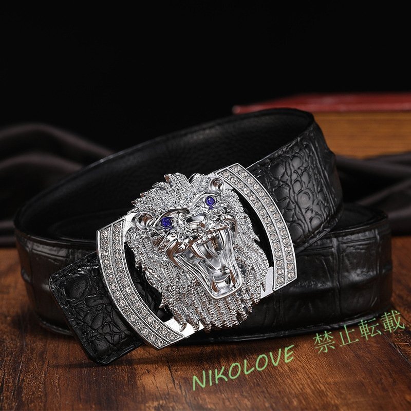 > 新品 お色選択可本革 ベルト メンズ クロコダイル ワニ柄 ビジネス スーツ 両用 大きいサイズ 120cm ライオンバックル カジュアル 黒