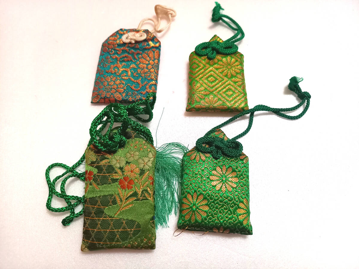 - 和柄 日本製 巾着 ポーチ 小物入れ お守り袋 こぎん刺し 古典柄 4つ まとめて デッドストック 緑