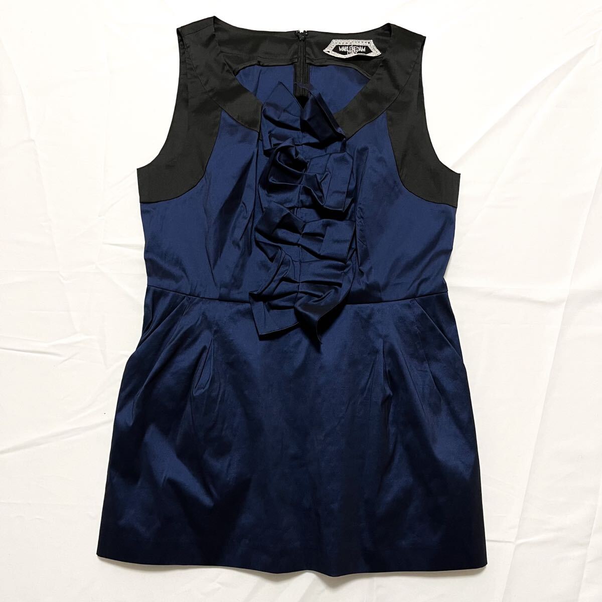 > 和707★ MARLENE DAM ITALY マーレンダム ノースリーブ チュニック フリル ブラウス 42 ネイビー ブラック レディース