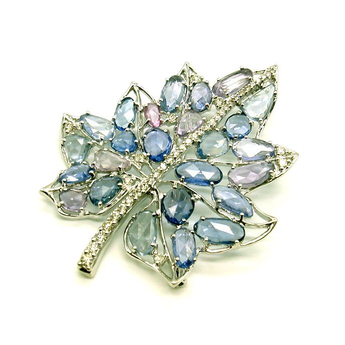 - B176:K18WG カラーサファイア ダイヤ 手造り ブローチ ペンダント【鑑別書付】