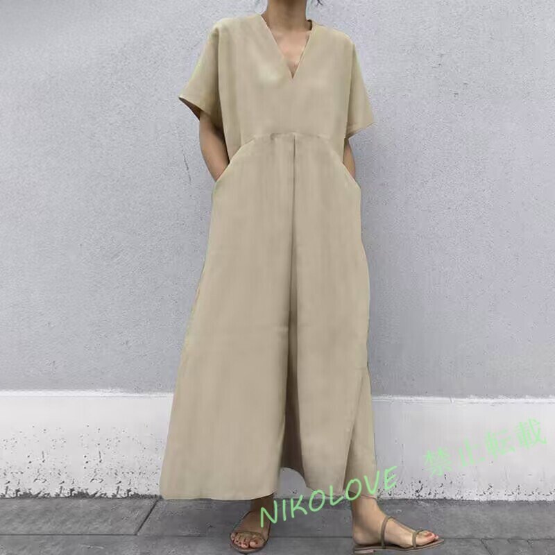 - 新品 ワンピース レディース ロングワンピース 半袖 綿麻 リネン マキシワンピースVネック ゆったり通気性 お洒落 着痩せ S~XL