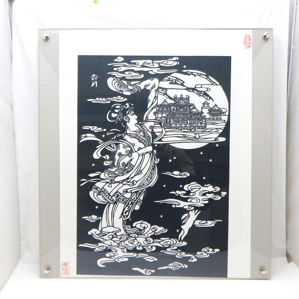 - 25-H-60 中国民間剪紙(切り絵) 田曠(上海在住作家) 嫦娥奔月 奔月 アクリル 額装 約44.5cm×41.5cm インテリア 壁掛け