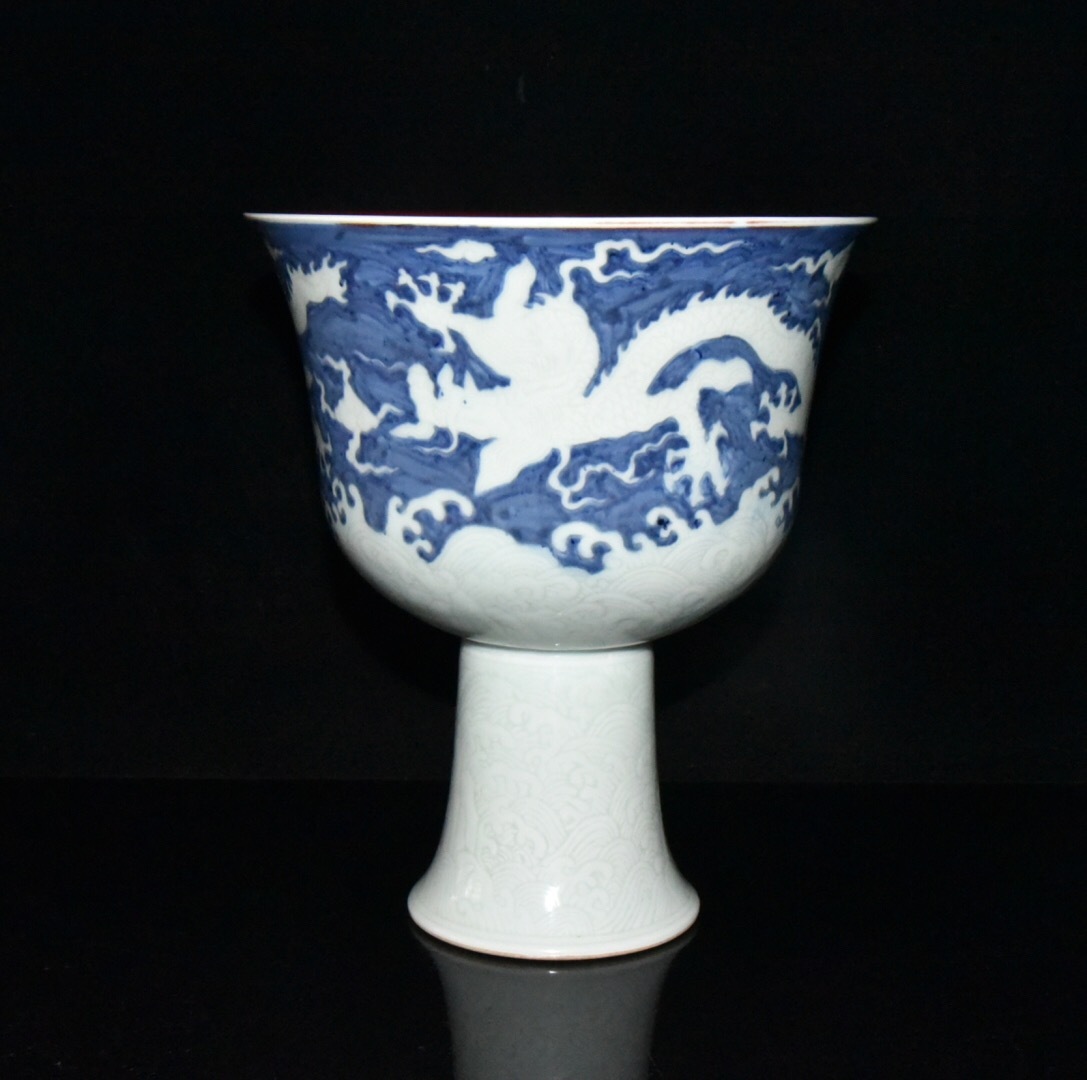 - 【超珍館蔵】明 宣德年製款 古陶瓷品 霽紅釉 青花 龍紋 高足碗 置物 古賞物 古美術品 稀少珍蔵品
