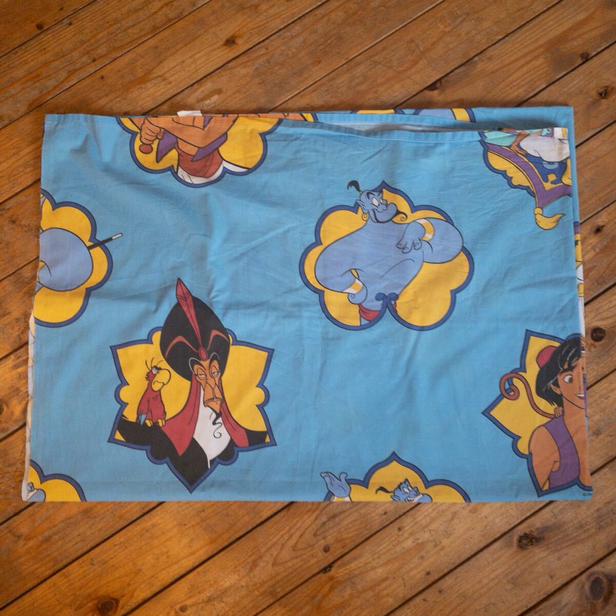 - USAヴィンテージ ベッドシーツ アラジン Disney リメイク生地 素材 ディズニー アブー ジーニー 総柄 フラットシーツ アメリカ仕入 B2531