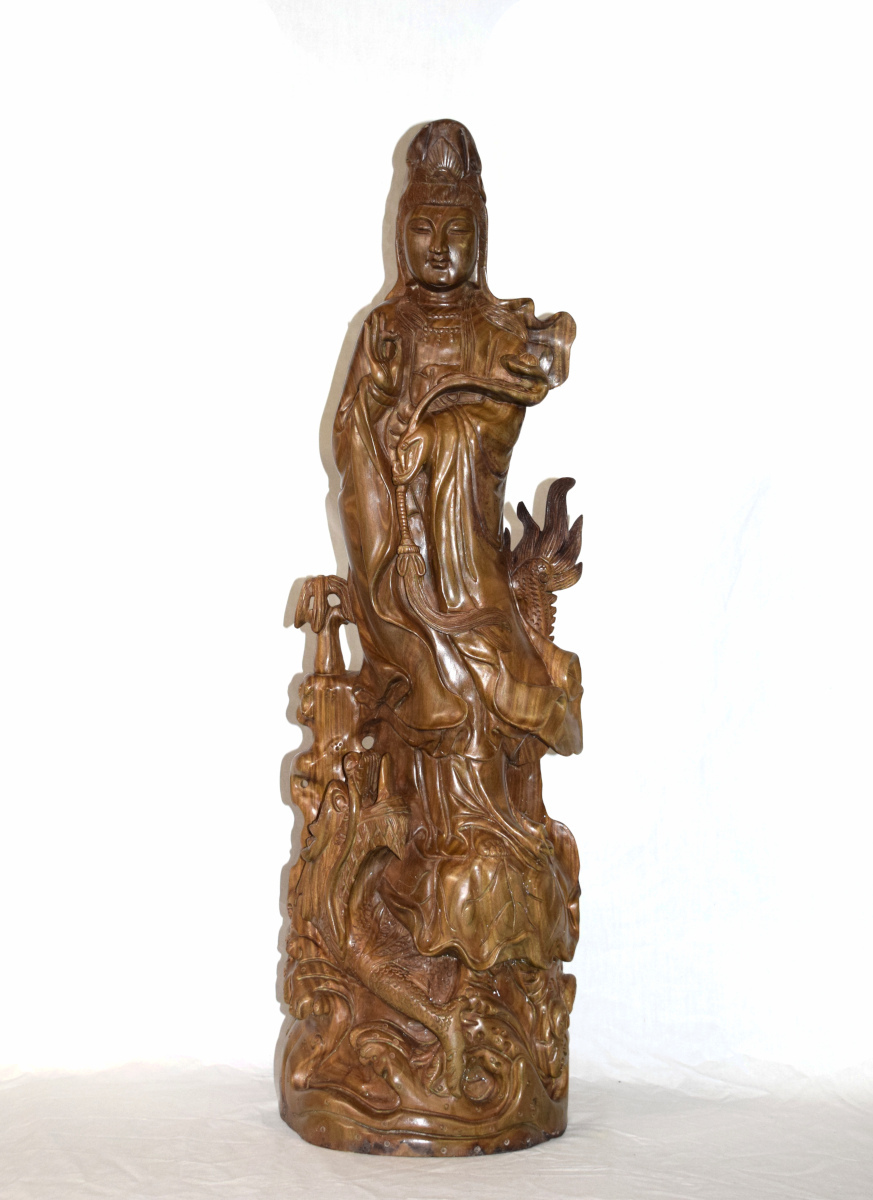- 龍上観音菩薩 緑檀 彫刻 生命の木 (生命樹) 高さ約80㎝ 一本彫り 仏像 仏教美術 長期保管品 【sa1-1t-1】