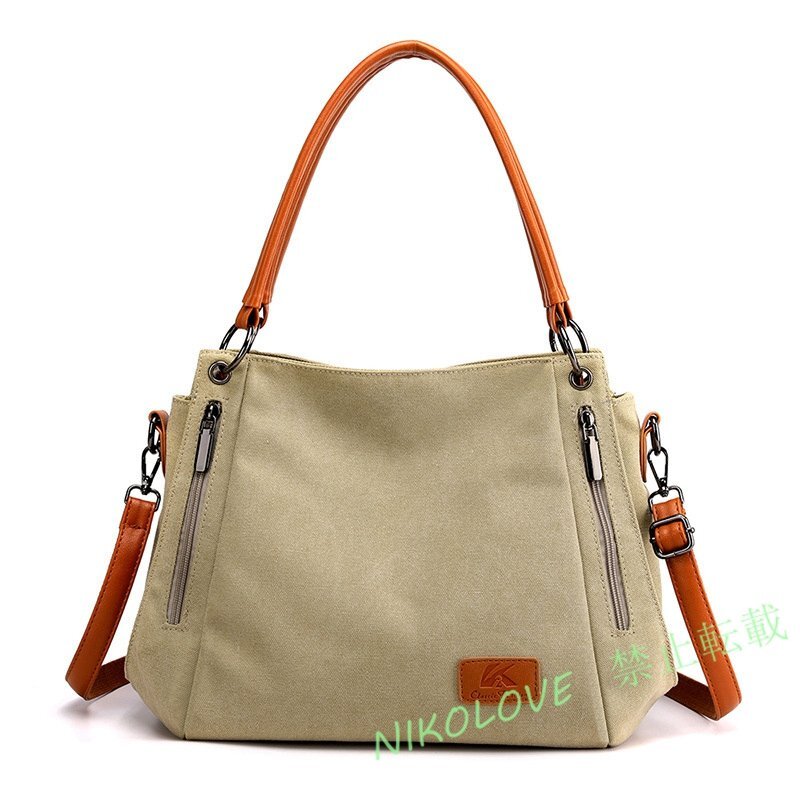 - 新品 トートバッグ ショルダーバッグ 帆布 男女兼用 シンプル 肩がけ 鞄 かばん メンズ 通勤通学 2ways カーキ