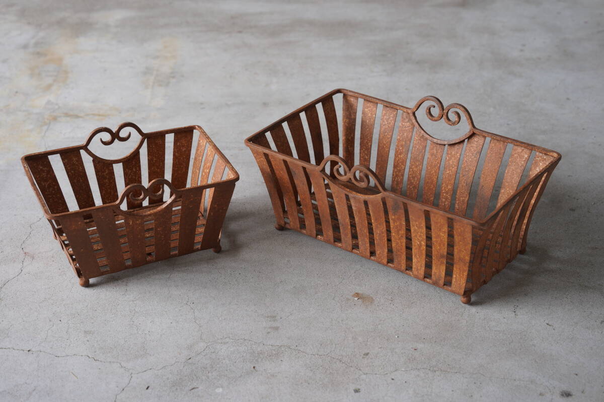 - アイアン 籠 カゴ 古道具 ガーデン 鉄製 インド ヴィンテージ アンティーク 収納 インテリア ディスプレイ バスケット ペア セット