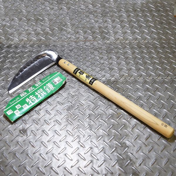 - 【新潟発】哲秀 最高級特撰 鎌 中厚 195mm 越後三条 現状販売 長期保管品 トレードマーク 農機具 農具 草刈り 雑草 庭 掃除 手入れ 中古