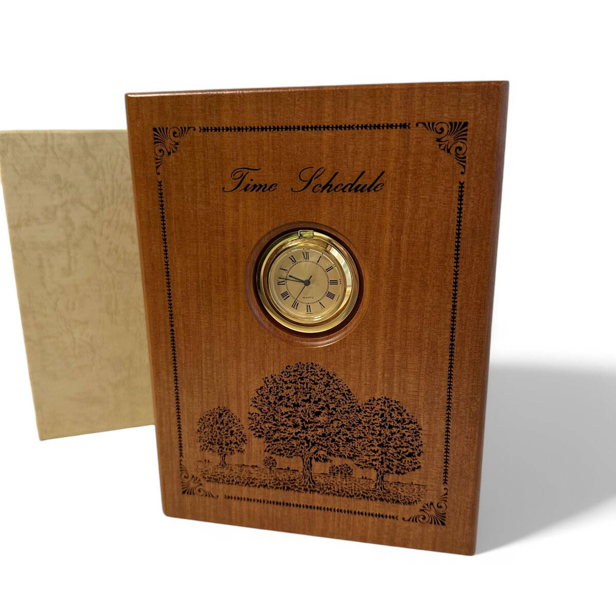 - T7-561 未使用 WOODREX 木製 ブック型 水晶時計&メモノート レーザー彫刻 マコーレ材 レフィール付 デスクアクセサリー 卓上 インテリア
