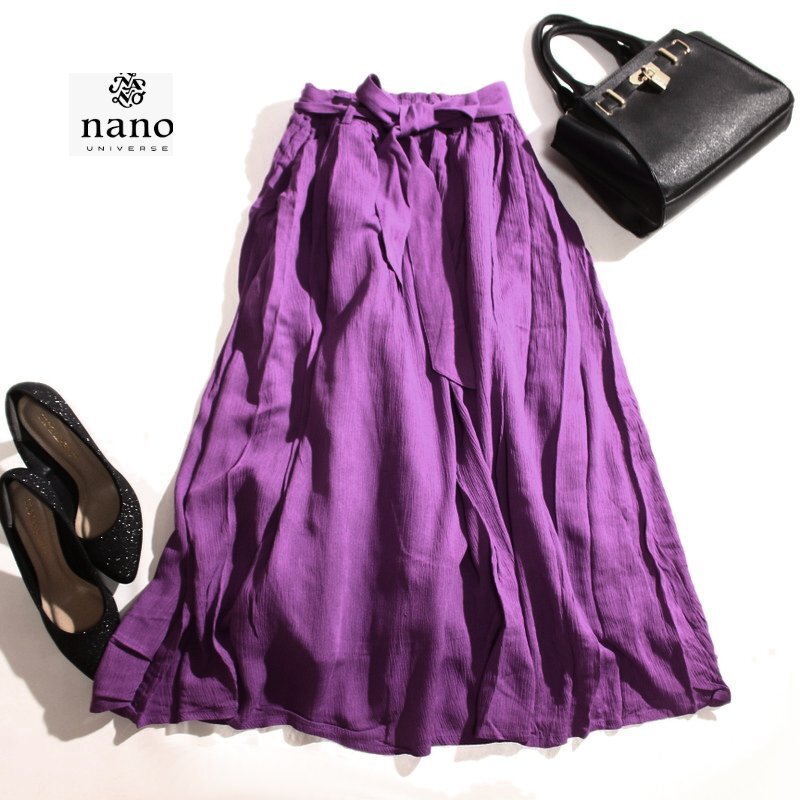 - 美品 ナノユニバース nano・universe 春 夏 しわ加工 ナチュラル ベルト付き ふんわり フレア ロングスカート F パープル 紫 スカート