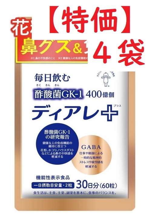 > キユーピーディアレプラス30日分4袋 スギ花粉サプリメント ヒノキ檜 酢酸菌GABA花粉症くしゃみ鼻水鼻づまりハウスダスト免役機能アレルギー