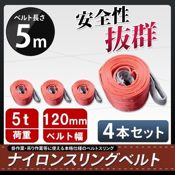 > 【送料無料】ナイロンスリングベルト 長さ5m×5000kg(5t)×幅120mm ◆4本セット◆ 荷揚げ 吊り上げ 吊り下げ 玉掛け運搬に