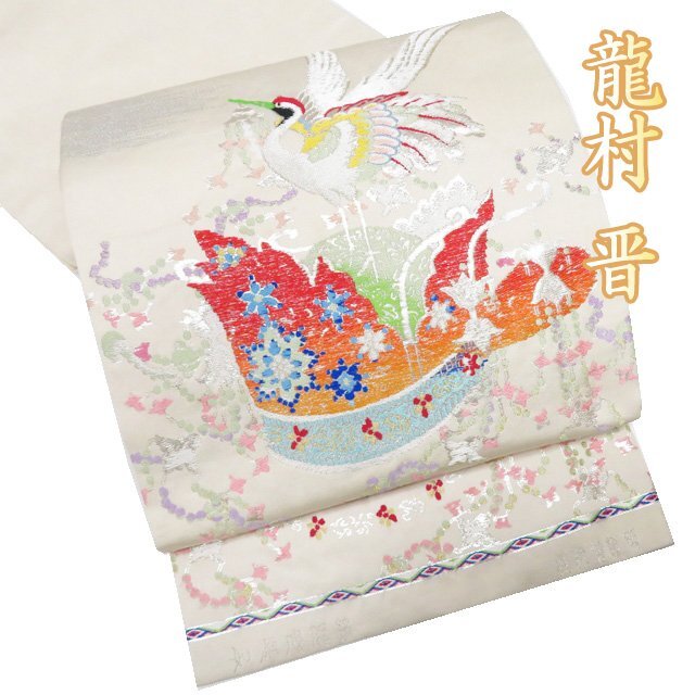 - 特選 袋帯 中古 リサイクル 正絹 フォーマル 仕立て上がり 龍村晋 千代乃冠 鶴 箔糸 灰白色 多色 金銀 きもの北條 A1180-21