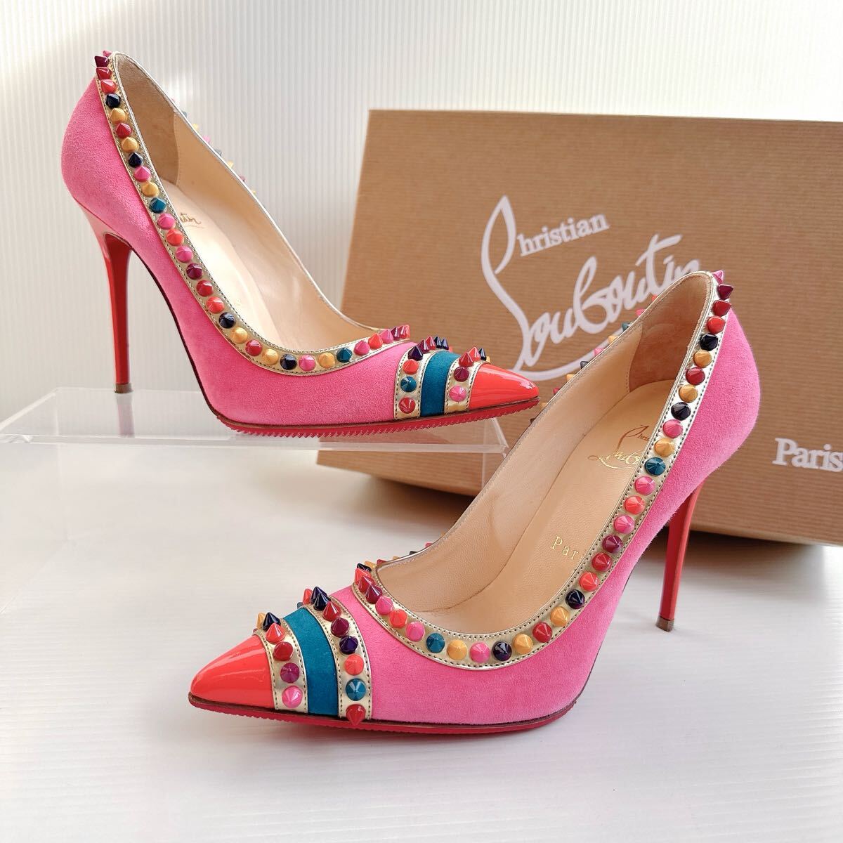 > Christian Louboutin クリスチャンルブタン スタッズ ハイヒール パンプス サンダル 37.5 極美品 靴 ピンク レザー